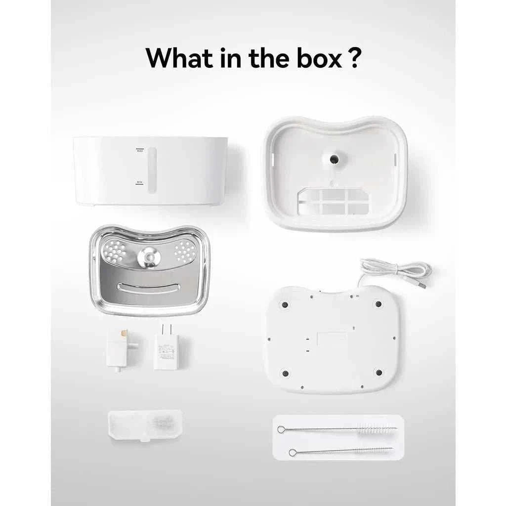 - ✓ Bandeja de acero inoxidable + filtración de triple capa: higiene óptima y agua siempre fresca.